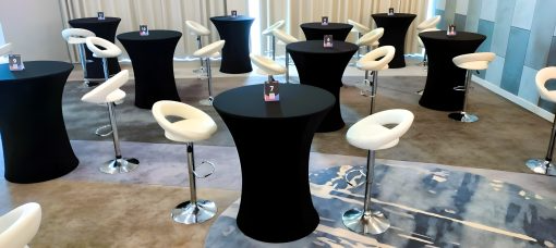 Almeria Leather Bar Stool is available for rent in Dubai, Abu Dhabi, UAE, GCC. This high chair is perfect for exhibitions, cocktail parties and private events. It has a leather seat with a low back and adjustable base for comfort. Pair with the Le Minou Grand Bar Table for the perfect set up. Contact us now to order the Almeria Leather Bar Stool or for any other event furniture need.