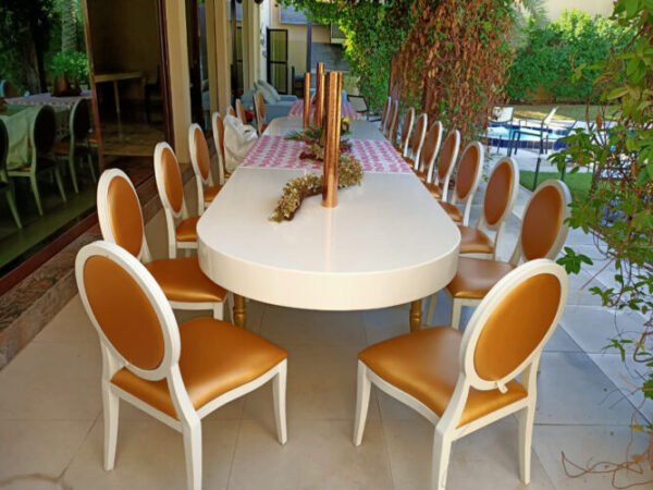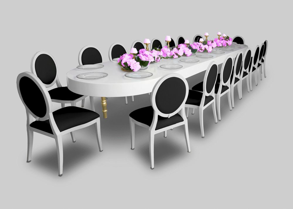 With a generous 5-meter length, it comfortably accommodates large gatherings while ensuring ample seating space. For a complete elegant setup, pair it with our White Dior Dining Chairs. Contact us today to reserve the Avalon Oval Gold Dining Table or to discuss your event furniture needs.