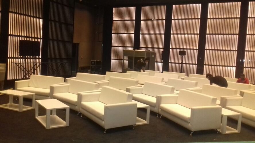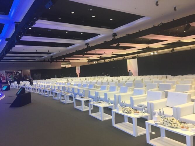 Use it as a side table in plenary setups, alongside VIP lounge seating, or as a stage side table. Its round shape pairs elegantly with curved single sofas, white armchairs, or even round poufs for casual gatherings. A square alternative is also available.
