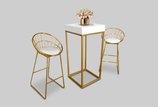 The Florence Gold Barstool available for rent in Dubai, Abu Dhabi, UAE, GCC. This wire bar stool is perfect for VIP events, cocktail parties and gala events. Pair with the Fontana Gold Wire Cocktail Table – White Top for the perfect set up. Also available in BLACK and WHITE. Contact us now to order the Florence Gold Barstool or for any other event furniture need or visit our INSTAGRAM page for set up inspiration.