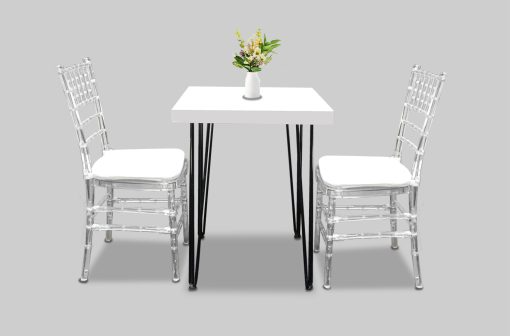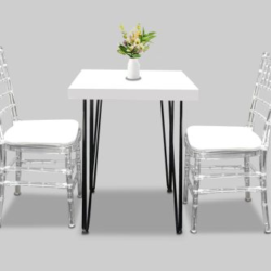 Hairpin Dice White Cafe Table, Black Legs for rent in Dubai, Abu Dhabi, UAE, GCC. This dining table is perfect for outdoor events like corporate gala, family days, private parties, exhibitions, cafe set up. Pair with the White Midnight Dior Dining Chair for the perfect set up. Also available as a COFFEE TABLE and as a HIGH TABLE. Contact us now to order the Hairpin Dice White Cafe Table, Black Legs or for any other event furniture need or visit our INSTAGRAM page for set up inspiration.