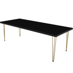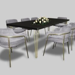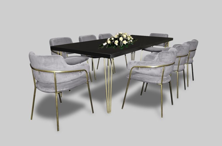 The Hairpin Grand Black Dining Table, Gold Legs for rent in Dubai, Abu Dhabi, UAE, GCC. This dining table sits maximum of 10 people and is good for gala dinners, outdoor events, VIP events. Pair with the Eleganza Velvet Chair – Gray for the perfect set up. Contact us now to order the Hairpin Grand Black Dining Table, Gold Legs or for any other event furniture need or visit our INSTAGRAM page for set up inspiration.