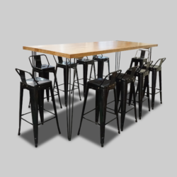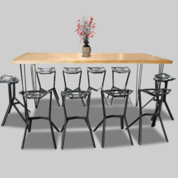 The Hairpin Grand Rustic High Table, Black Legs for rent in Dubai, Abu Dhabi, UAE and GCC. This bar table is perfect for outdoor and rustic themed events. Pair with the Scandinavian Bar Stool for the perfect set up. Seats up to 10 people. Also available as a COFFEE TABLE and DINING TABLE. Contact us now to order the Hairpin Grand Rustic High Table, Black Legs or for any other event furniture need or visit our INSTAGRAM page for set up inspiration.