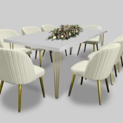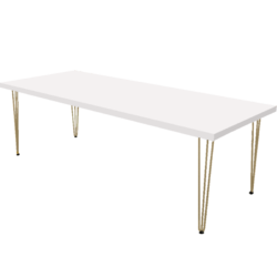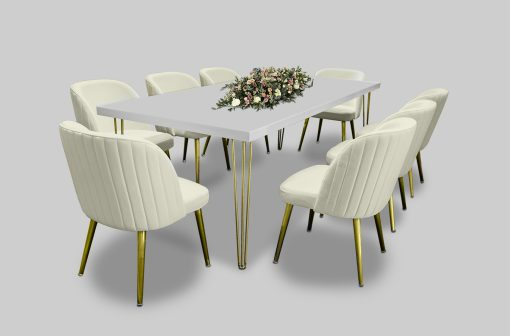 Hairpin Grand White Dining Table, Gold Legs for rent in Dubai, Abu Dhabi, UAE, GCC. This dining table is great for VIP events, gala dinner, corporate events. Pair with the Ivory Velvet Dining Chair for the perfect set up. Seats a maximum of 10 people. Contact us now to order the Hairpin Grand White Dining Table, Gold Legs or for any other event furniture need or visit our INSTAGRAM page for set up inspiration.