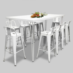 Hairpin Grand White High Table is available for rent in Dubai, Abu Dhabi, UAE and GCC. This bar table can sit up to 10 people and is great for any type of event. Pair with the Pauchard Metal Bar Stool – White for the perfect set up. Also available as a COFFEE TABLE. Contact us now to order Hairpin Grand White High Table or for any other event furniture need or visit our INSTAGRAM page for set up inspiration.
