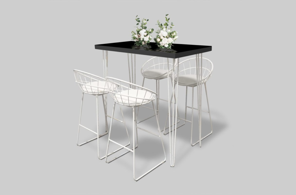 Hairpin Rectangular Black High Table, White Legs for rent in Dubai, Abu Dhabi, UAE, GCC. This cocktail table is great for outdoor events, exhibitions, cocktail parties. Pair with the Pauchard Metal Bar Stool – Black for the perfect set up. Also available as a COFFEE TABLE. Contact us now to order the Hairpin Rectangular Black High Table, White Legs or for any other event furniture need or visit our INSTAGRAM page for set up inspiration.