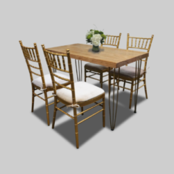 Hairpin Rectangular Rustic Dining Table, Gold Legs for rent in Dubai, Abu Dhabi, UAE, GCC. This cafe table is great for outdoor events, exhibitions, rustic themed events, private events. Pair with the Eleganza Velvet Chair – Blue for the perfect set up. Contact us now to order the Hairpin Rectangular Rustic Dining Table, Gold Legs or for any other event furniture need or visit our INSTAGRAM page for set up inspiration.