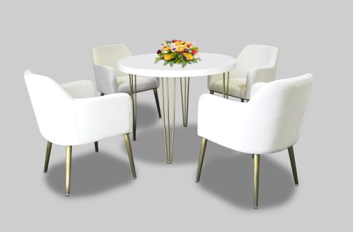 Hairpin Round White Dining Table, Gold Legs for rent in Dubai, Abu Dhabi, UAE, GCC. This cafe table is great for outdoor events, exhibitions, and cafe set up. Pair with the Ivory Velvet Dining Chair for the perfect set up. Contact us now to order the Hairpin Round White Dining Table, Gold Legs or for any other event furniture need or visit our INSTAGRAM page for set up inspiration.