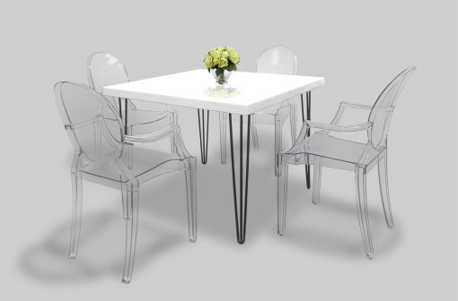 Hairpin Square White Dining Table, Black Legs for rent in Dubai, Abu Dhabi, UAE, GCC. This cafe table is great for exhibitions, outdoor events, private parties. Pair with the White Midnight Dior Dining Chair for the perfect set up. Also available as a COFFEE TABLE and as a HIGH TABLE. Contact us now to order the Hairpin Square White Dining Table, Black Legs or for any other event furniture need or visit our INSTAGRAM page for set up inspiration.