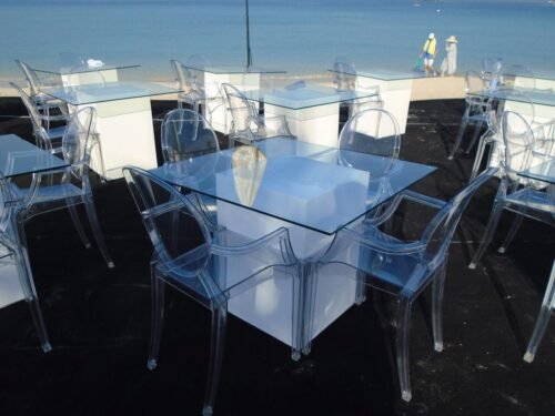 Le Minou Square Glass Dining Table for rent in Dubai, Abu Dhabi, UAE. This dining table is perfect for cafe set up, conferences and private parties. Pair with the Dauphin Ghost Chair for the perfect set up. Contact us now to order the Le Minou Square Glass Dining Table or for any other event furniture need.